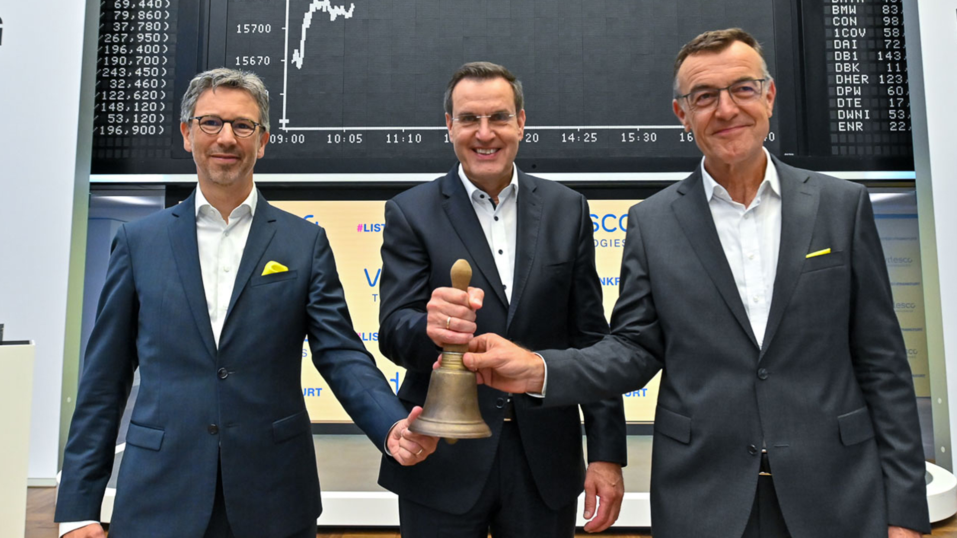 Frankfurt/Regensburg, 16. September 2021. Vitesco Technologies, ein international führender Entwickler und Hersteller moderner Antriebstechnologien für nachhaltige Mobilität, hat heute mit der Handelsaufnahme seiner Aktien an der Frankfurter Wertpapierbörse sein erfolgreiches Börsendebüt gefeiert. Der erste Kurs der Aktie lag bei 59,80 Euro.