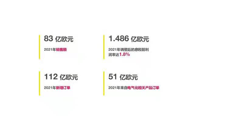 新能源科技事业部以同比44.6%的有机增速表现最为强劲,调整后的息税前利润率提高了约39%,电气化产品的销售额达8.88亿欧元。